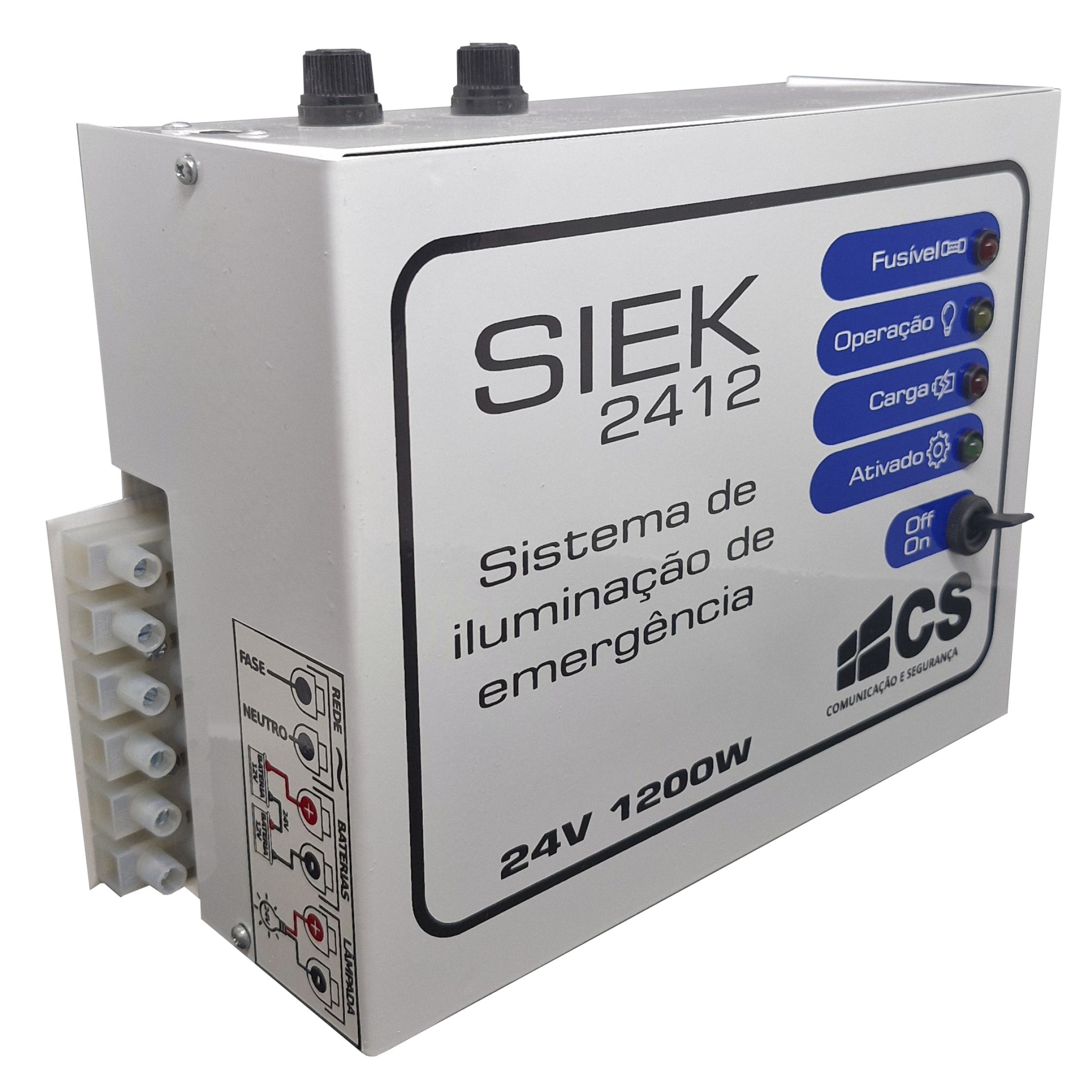 Os Sistemas de Iluminação de Emergência CS são sistemas de carga de comunicação automática para baterias de 24VDC, utilizando circuito eletrônico para controle e manutenção de carga, comutação e sinalização. Havendo energia elétrica no local, o sistema permanece carregando a(s) bateria(s) ou mantendo a carga da(s) mesma(s). Faltando energia o sistema ativa automaticamente a saída para as lâmpadas de iluminação de emergência. Quando a energia retorna as lâmpadas desligam automaticamente, o sistema se rearma e passa a carregar a(s) bateria(s) sem necessitar de nenhum comando externo.