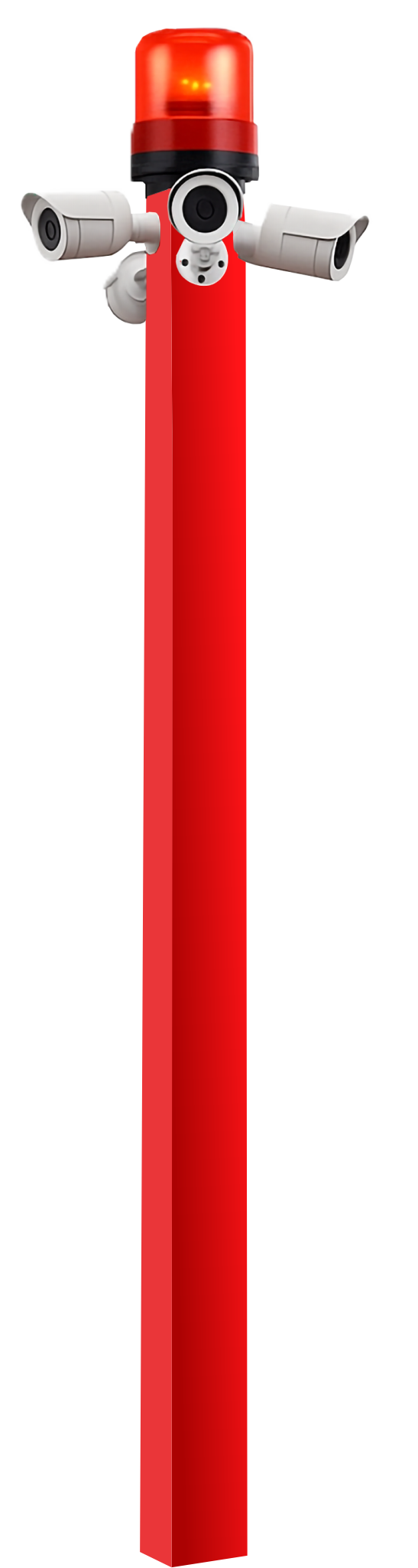 Totem de fibra Retangular com dimensões de 09 x 11 cm. Altura do Poste de 3,60 metros. Fixação do poste deve ser por engastamento ao chão (0,60 metros para engastar no chão). Totem montado com switch, fonte, giroflex, cabos e câmeras com suporte de acabamento. O modelo de câmeras pode ser selecionado conforme necessidade. Pintura padrão do Poste em Vermelho e pode ser personalizada. O Totem pode conter adesivação personalizada com a sua marca.