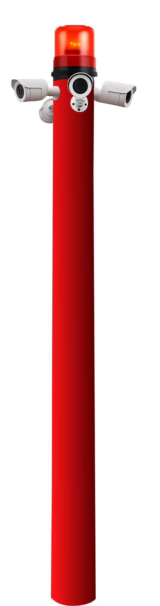 Totem de fibra com diâmetro na base de 18 cm e diâmetro superior de 14 cm. Altura do Poste de 3,60 metros. Fixação do poste deve ser por engastamento ao chão (0,60 metros para engastar no chão). Totem montado com switch, fonte, giroflex, cabos e câmeras com suporte de acabamento. O modelo de câmeras pode ser selecionado conforme necessidade. Pintura padrão do Poste em Vermelho e pode ser personalizada. O Totem pode conter adesivação personalizada com a sua marca.